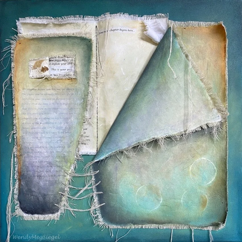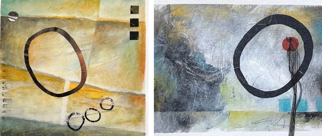 These paintings were inspired by the elements and imagery on the pages of multiple sketchbooks completed in the past couple of years. I have been playing with the circle, grid, and collage elements. Each painting has a quote embedded into the background of the design, under the paint, present yet not readable.